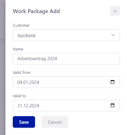 Es öffnet sich eine Sidebar, wo sich Kunde, Name, Anfangsdatum und Enddatum des Vertragszeitraums eintragen lassen. Über die Schaltfläche “Save” wird der Eintrag gespeichert und angezeigt.