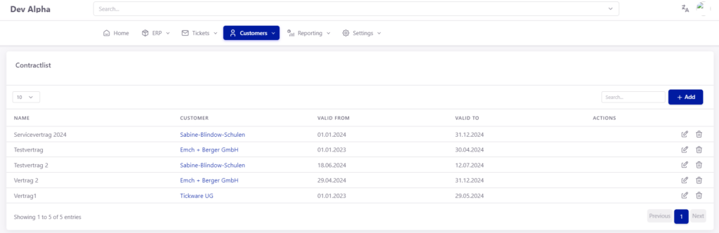 Unter dem Menüeintrag Customers -> Contracts erhalten Nutzer mit den entsprechenden Berechtigungen eine Übersicht über allen Verträgen inkl. Name, Kunde, Anfangsdatum und Enddatum des Vertragszeitraums. Über die Schaltfläche „+ Add“ lassen sich neue Verträge anlegen.